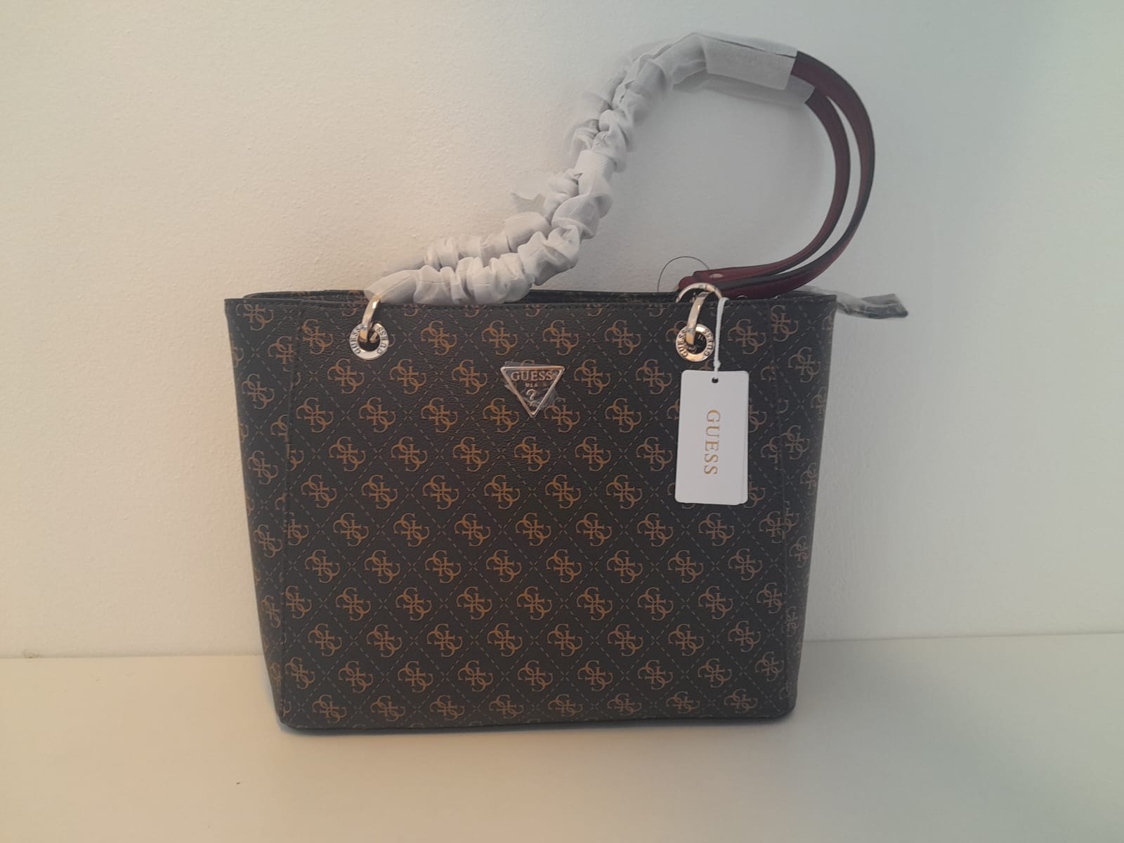 Elegante e raffinata, la Borsa Guess Beige è realizzata in ecopelle marrone scuro con logo beige. Grazie ai suoi 3 scomparti e alla chiusura a cerniera, ti permette di organizzare al meglio i tuoi oggetti. Dotata di manici a tracolla in rosso, è perfetta per ogni stagione e aggiunge un tocco di classe a ogni outfit. Dimensioni: altezza cm 26, larghezza cm 34.